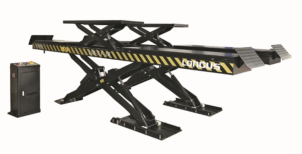 Longus hat zwei Modellreihen im Programm. Die Scherenbühnen der ‚LSB‘-Baureihe eignen sich demnach besonders für die Fahrwerksvermessung und sind deshalb serienmäßig mit Schiebeplatten und variablen Aussparungen für Drehteller und einem Radfreiheber ausgestattet. Die Bühne ist in unterschiedlichen Ausführungen erhältlich: als Modell ‚LSB-5.5-SB‘ mit 5,5 Tonnen Tragkraft für den bodenebenen Einbau. Zur Montage auf dem Werkstattboden gedacht und mit 4,5 beziehungsweise 5,5 Tonnen Tragkraft ausgestattet sind die Modelle ‚LSB-4.5-SE‘ beziehungsweise ‚LSB-5.5-SE‘. Die Auffahrhöhe für diese Überflurbühne gibt Longus mit vergleichsweise niedrigen 220 Millimetern an. Auch für diese beiden Modelle sind Achsfreiheber optional erhältlich.