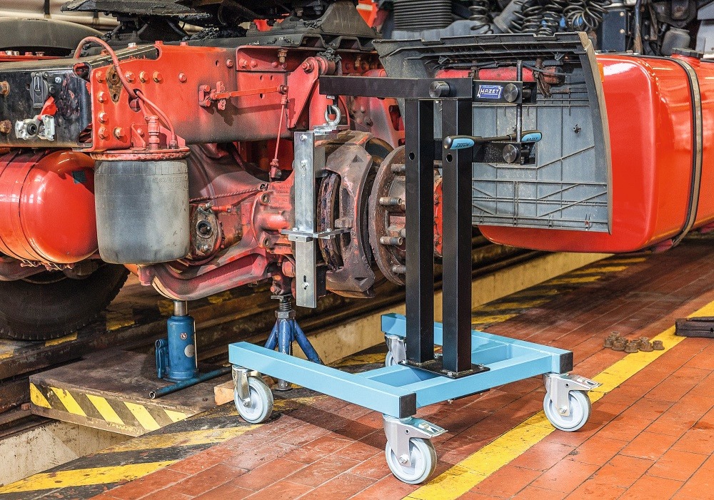 Arbeiten an Achsen und Bremsen gehören zu den ungeliebten ‚Schwerstarbeiten‘ in der Nutzfahrzeug-Werkstatt. Einerseits, weil das Gewicht einzelner Komponenten schnell ‚ins Kreuz‘ gehen kann und andererseits, weil der Platz für das Arbeiten zu zweit vielfach zu beengt ist. Abhilfe soll deshalb die Hebehilfe ‚4972-1/3‘ schaffen, die sich die Produktmanager von Hazet speziell für Nutzfahrzeug-Profis haben einfallen lassen.