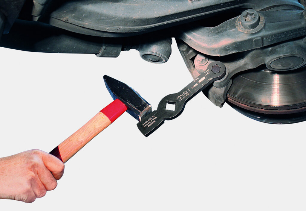 Dank einer einseitig gefrästen Fase am Schlüsselkopf soll sich der Schlag-Schlüssel auch an schwer zugänglichen Stellen sicher einsetzen lassen. Damit der Mechaniker die sicherheitsrelevanten Bremssattelschrauben mit dem vom Hersteller vorgeschriebenen Drehmoment festziehen kann, verfügt der Schlüssel über einen ¾-Zoll-Innenvierkant, um den Drehmomentschlüssel aufnehmen zu können.