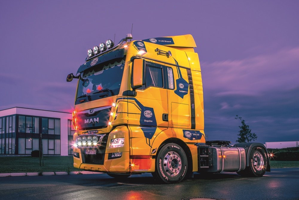 Highlight sind zweifelsohne die Shapeline-Leuchten, die ein äußerst individuelles Erscheinungsbild der Zugmaschine ermöglichen. Denn mit der modular aufgebauten Leuchten-Baureihe, von der es mit ‚Tech‘ und ‚Style‘ zwei unterschiedliche Varianten gibt, lassen sich laut Hella Lichtsysteme nach dem Baukastenprinzip zusammenstellen. Die Beleuchtung der Zugmaschine ist komplett im Style-Design umgesetzt. Im Heckbereich realisieren die Leuchten das Heck-, Rückfahrund Nebelschlusslicht. Dazu sind insgesamt sechs Module angebracht. Das erzeugt eine individuelle Lichtsignatur. Darüber hinaus kommen noch eine ganze Reihe anderer Leuchten aus dem Hella-Programm zum Einsatz. Eine genaue ‚Bestückungsliste‘ des Show-Trucks sowie ein Video der ‚Lippstädter Lichtgestalt‘ in Aktion gibt es unter www.hella.com/truck.