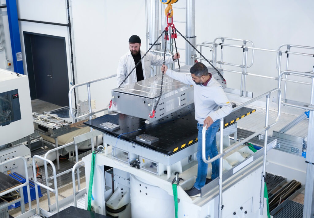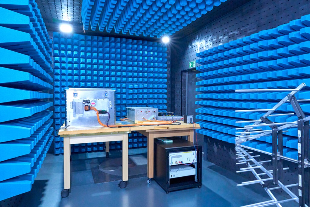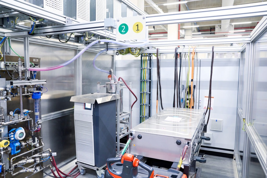 Am Standort in Darmstadt befindet sich neben der Produktionslinie auch ein hochmoderner Test- und Entwicklungscenter. Beispielsweise können mit einem ‚Shaker‘ die Batteriepacks definierten Dauerbelastungen ausgesetzt werden. Zusätzlich sind Dichtheitsprüfungen mittels Wasservorhang sowie Kälte- und Wärmetests in einer Klimakammer möglich. In einem separaten Labor werden unter strengen Sicherheitsbedingungen einzelne Batteriezellen auf Herz und Nieren geprüft. Last but not least steht eine abgeschirmte EMV-Kammer zur Verfügung. Sie ist ein zentraler Bestandteil der Prüfung auf elektromagnetische Verträglichkeit der Hochvoltbatterien.