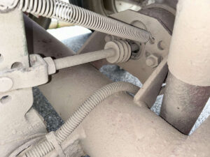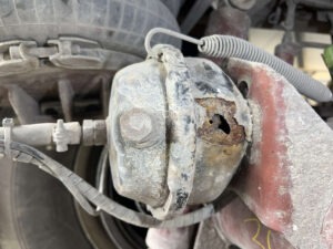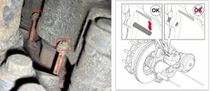 Die Überprüfung der Bremszylinder gestaltet sich etwas einfacher, da sie auf dem Achsträger montiert sind. Sie ähnelt der bei Scheibenbremsen. Sind die Bremszylinder an den korrekten (gleichen) Bohrungen montiert und haben die Kolbenstangen ausreichend Platz zum Achskörper? Auch hier muss der Bremszylinder festmontiert sein. Gelegentlich kommt es vor, dass die Aufnahme der Zylinder (Schweißnaht) am Achskörper beschädigt oder gar gerissen ist.