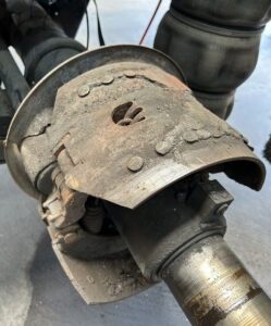 An der Antriebsachse des Lkw sind die gleichen Checks vorzunehmen. Bauartbedingt ist die hier Sicht auf die Bremsanlage jedoch meistens stark eingeschränkt. Die Rückseite ist zudem meistens mit einem Abdeckblech versehen. Mit Hilfe eines Inspektionsspiegels oder eines Endoskops kann jedoch eine Sichtprüfung des Tragbilds und der Bremsbeläge vorgenommen werden.