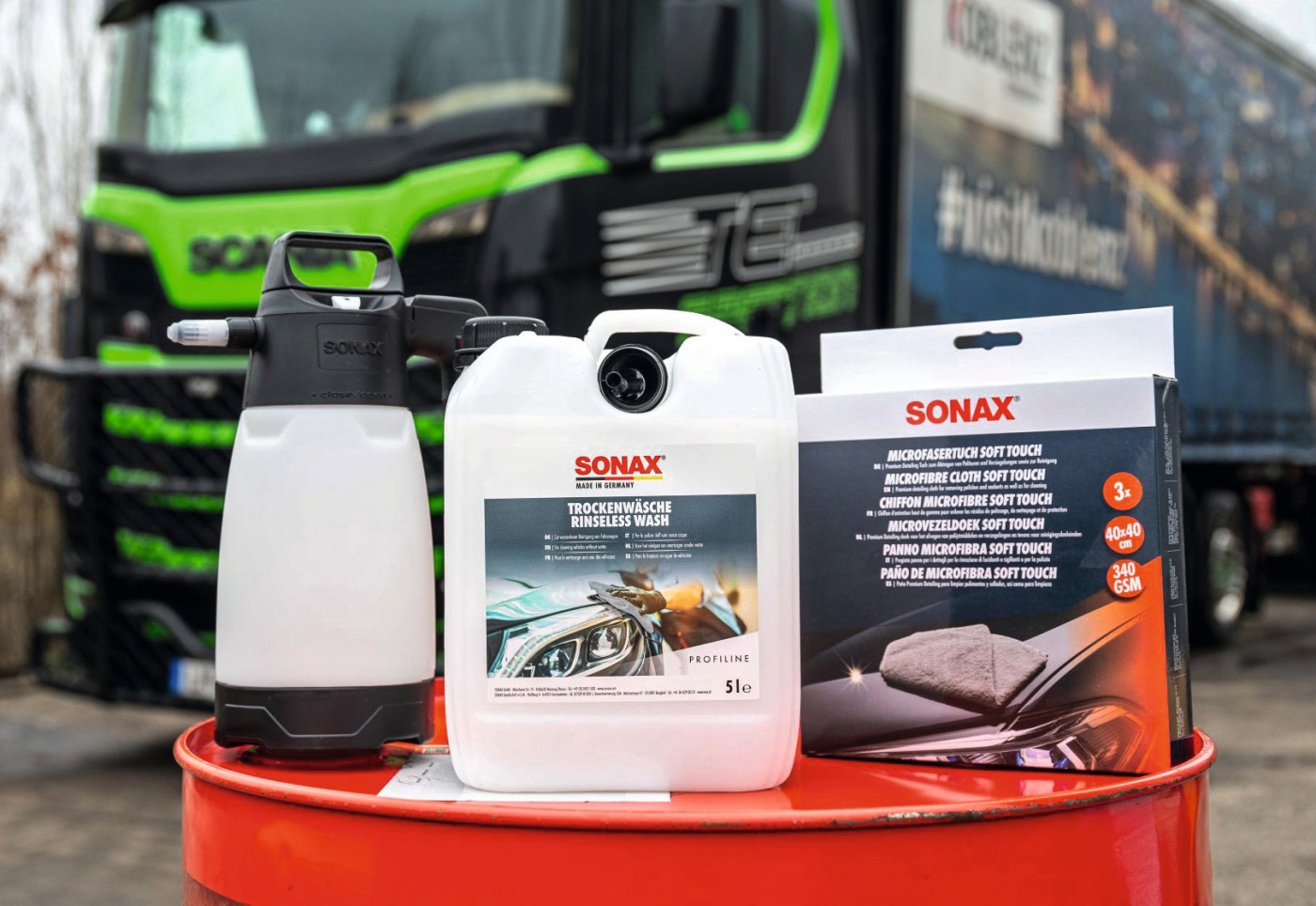 Sonax präsentiert auf der NUFAM in Karlsruhe sein Reinigungs- und Pflege-Portfolio für Nutzfahrzeuge. Beispielsweise zeigt das Unternehmen die sogenannte ‚Trockenwäsche‘. Der entsprechende Reiniger ist tatsächlich für die schnelle und wasserlose Wäsche zwischendurch gedacht. Wasserlos bedeutet laut Sonax wortwörtlich, dass die Wäsche ohne Wasser schonend alle verschmutzten Oberflächen reinigt. Dabei sei die Wirkweise des Reinigers simpel: Die Formel enthält Pflegekomponenten, die sich an den Schmutz binden und ihn einkapseln, damit es zu keiner Verkratzung beim Nachwischen kommt. Und da keine Abwässer entstehen, kann man den Reiniger jeder Zeit und überall anwenden.