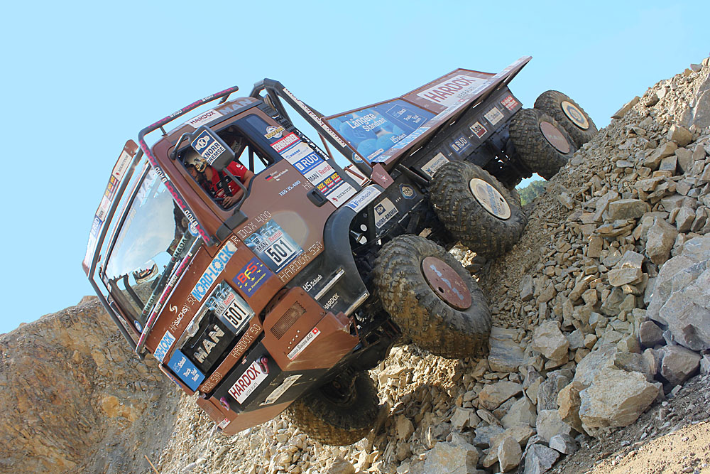 Am Samstagabend blieben die frischgebackenen Europameister mit ihrem MAN TGS in Sektion 3 an einem großen Felsblock, den es zu überwinden gab, stecken. Da half alles wollen nicht mehr und der braune Bolide musste den Bergungsdienst in Anspruch nehmen. Um keine weiteren Punkte zu verlieren, mussten anschließend das Werkstattteam um Alexander Bieg die bei der Havarie zu Schaden gekommene Lenkung reparieren, damit die beiden Trialpiloten in gewohnter Manier ihren EM-Lauf fortsetzen konnten.