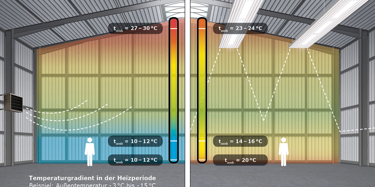 Durch die auch vertikal sehr gleichmäßige Temperaturverteilung im Raum geht zudem weniger Energie durch das Hallendach verloren. Ebenso entweicht weniger Energie beim Öffnen von Toren, wie es bei der Erwärmung mit Lufterhitzern der Fall ist. Im Gegensatz dazu reduziert sich mit den Deckenstrahlplatten der Verlust, weil die Hüllflächen die Wärme nicht so schnell abgeben. Die Temperatursprünge, die durch das Toröffnen entstehen, sind kleiner und schneller ausgeglichen. Sobald die Tore wieder geschlossen werden, strahlen die warmen Umschließungsflächen und die Deckenstrahlplatten Wärme an den Raum ab. Weil nicht das gesamte Luftvolumen wie bei einer Warmluftheizung neu erwärmt werden muss, werde so laut RMBH in Summe eine hohe Einsparung bei hohem Komfort erzielt.