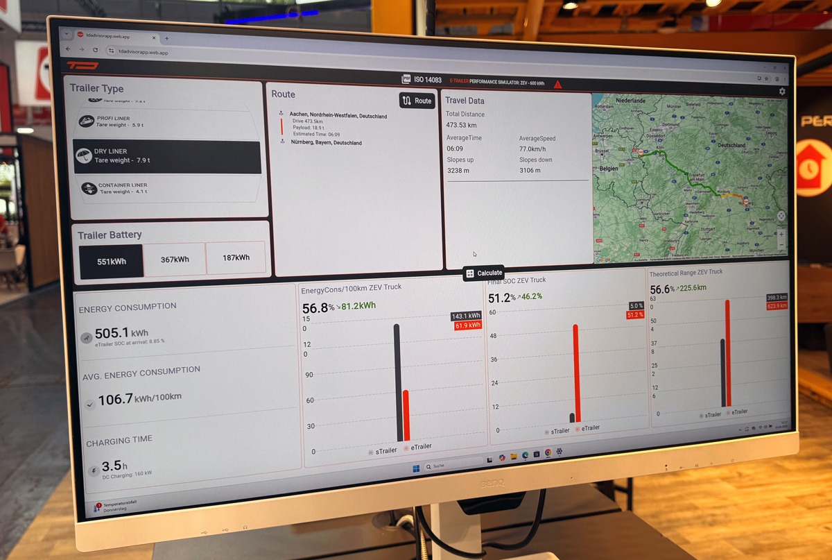 Trailer-Dynamics ist ein Partnerunternehmen von Krone und bietet mit dem eTrailer ein umfassendes Lösungskonzept für die Dekarbonisierung des Schwerlast-Güterverkehrs auf der Langstrecke. Dies gelingt durch die Einrichtung eines zusätzlichen batterieelektrischen Antriebsstrangs im Trailer. Dabei wird der eTrailer herstellerunabhängig in Echtzeit-Steuerung mit der Sattelzugmaschine synchronisiert. Er unterstützt gleichsam den Primärantrieb der Diesel-Sattelzugmaschine und ermöglicht dadurch laut Trailer-Dynamics eine signifikante Kraftstoff- und CO2-Reduktion. Je nach Topografie und Nutzlastsituation sei so eine Kraftstoffersparnis bis zu 40 Prozent möglich. „In Verbindung mit einer batterieelektrischen Sattelzugmaschine ermöglicht der eTrailer als Range-Extender zudem eine deutliche Reichweitenerhöhung“, ergänzt Michael W. Nimtsch, einer der Geschäftsführer von Trailer-Dynamics. Aktuell bietet das Unternehmen den ‚eBox-Trailer‘ zur Bestellung an. Die ersten Auslieferungen sollen bereits 2025 erfolgen. Weitere eTrailer-Lösungen mit unterschiedlichen Aufbauten auf Basis von Krone-Lösungen, sollen stufenweise bis 2027 serienreif sein.