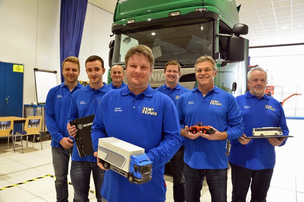 Das beste Werkstatt-Team von Scania in Deutschland steht fest: Das Münchner Team mit Claus Strohmeier, Daniel Bratzler, Verto Enache, Michael Ries, Marco Brandel, Klaus Schart und Azubi Erik Prüfer hat beim Servicewettbewerb ‚Top Team‘ von Scania gesiegt und einen Gutschein in Höhe von 1.000 Euro erhalten.